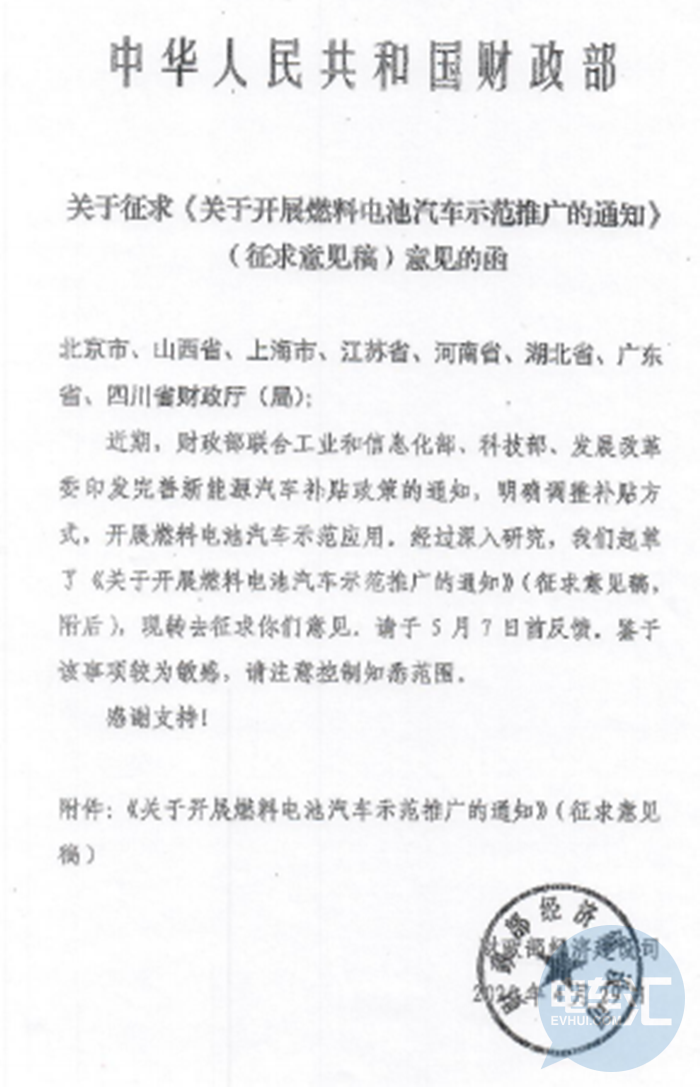 中国氢燃料汽车网 5月10消息 据电车汇报道:5月9日,一份由财政部发出的《关于征求<关于开展燃料电池汽车示范推广的通知>(征求意见稿)意见的函》(下称《征求意见函》)在网络间流传。文件显示:示范期间,要推广超过1000辆达到相关技术指标的燃料电池汽车,平均单车累积用氢运营里程超过3万公里。此次被具体征求意见的有北京市、山西省、上海市、江苏省、河南省、湖北省、广东省、四川省财政厅(局)等八个省份。《征求意见函》发出日期为4月29日,征求意见截止时间为5月7日。